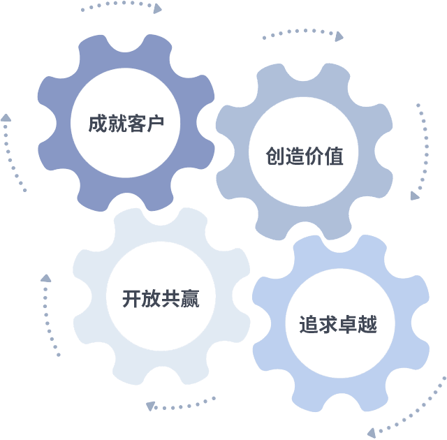 成就客户是一切决策的出发点,,,创造价值是衡量所有工作的标准,,追求卓越是我们做事做人的态度,,开放共赢是我们的格局也是最终的结果。。。。价值观的齿轮环环相扣,,推动着组织里的每个人不断向前。。。